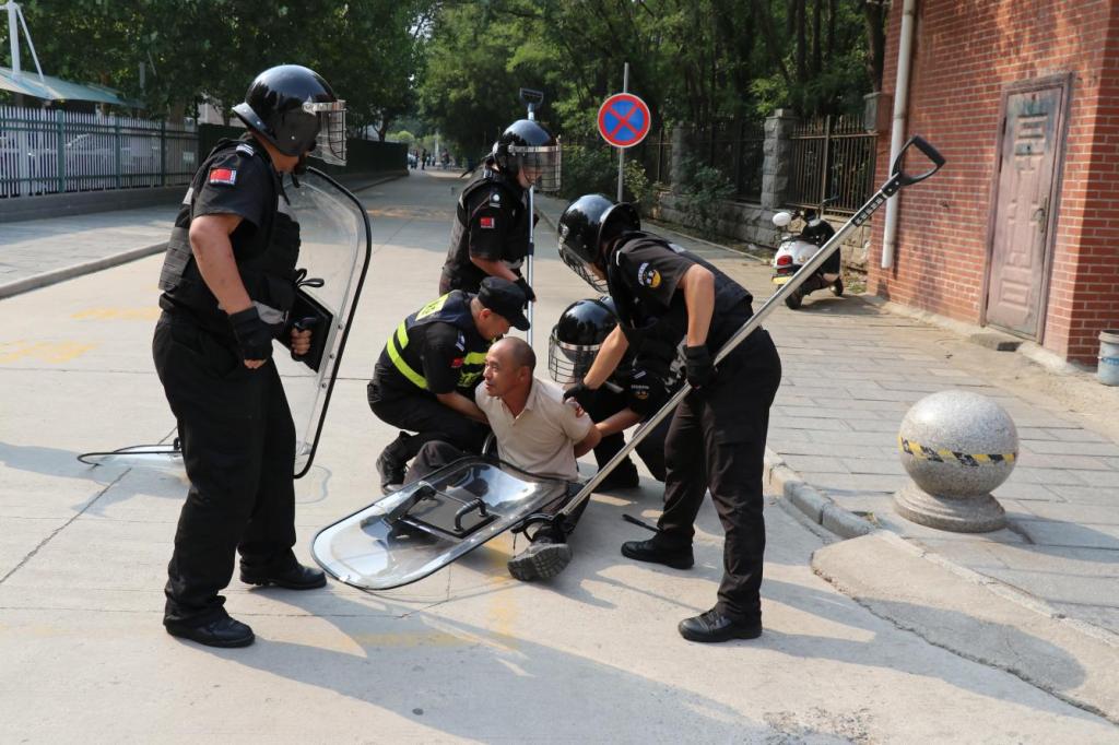 演习中,执勤门卫发现2名神情异常人员欲尾随学生混入校园,坚决阻止其进入;“暴徒”受阻后强行闯岗,一人持凶器恐吓门卫,一人持凶器劫持学生;门卫呼叫增援,并利用岗位上防暴器械进行阻挡;快速反应小组迅速出击,利用盾牌、钢叉、警棍等警具,制服“暴徒”后移交警方。